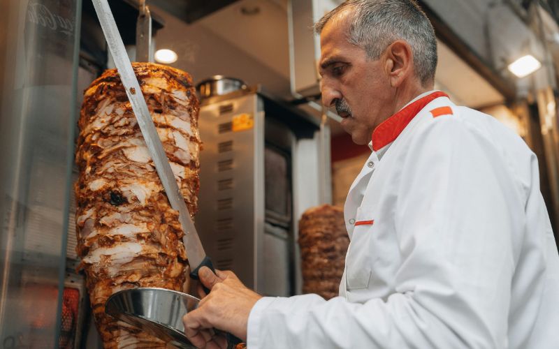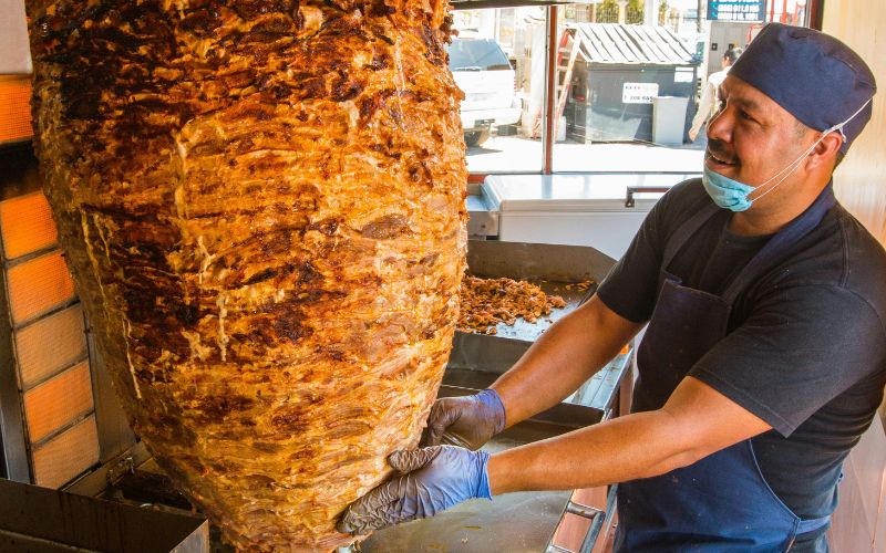 Shawarma is a popular Middle Eastern dish made from thin slices of marinated meat stacked on a vertical rotisserie. As the meat slowly rotates and cooks, the outer layers become crispy while the inside stays juicy and tender.
