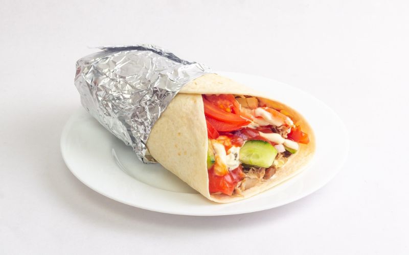 The cooking method evolved from the Turkish dish doner kebab, where meat is stacked and slowly roasted on a vertical spit.